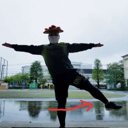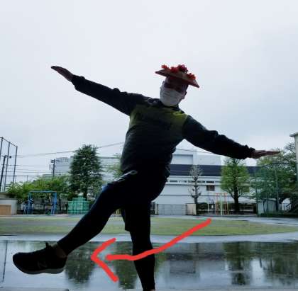 片足で立って、浮かせた足を大きく左右に振る。