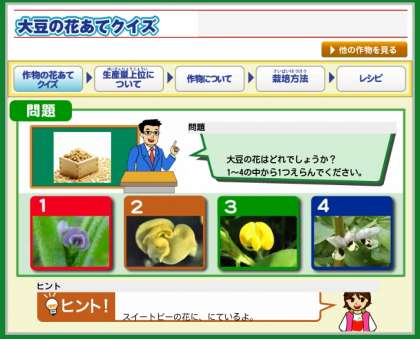 さて、「おこめ、じゃがいも、だいず」のお花はどれか分かりますか?