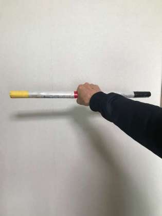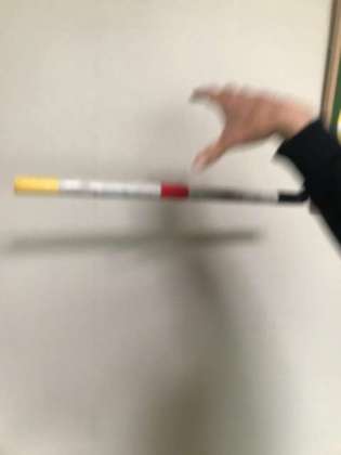 2、両手をはなして、スティックが落ちる前に、真ん中の色を片手でつかみます。
