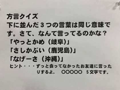 みんな、方言に興味を持ってくれたかな?それでは、方言クイズの第3弾です。わかった人は、その方言を使って短い文を書いてみてくださいね。
