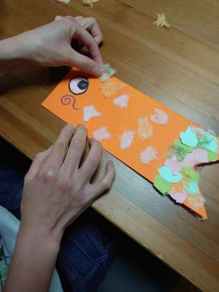 そして、ちぎった紙に薄くのりをつけて、鯉の鱗のようになるよう、貼っていきます。