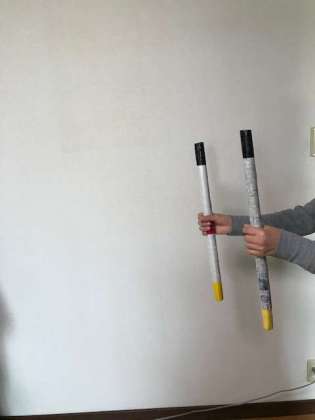 3、受け取る人は、右手と左手で1本ずつ同時にスティックの真ん中をつかみます。