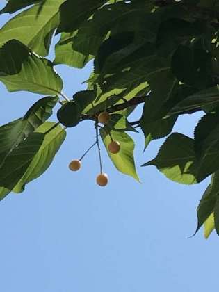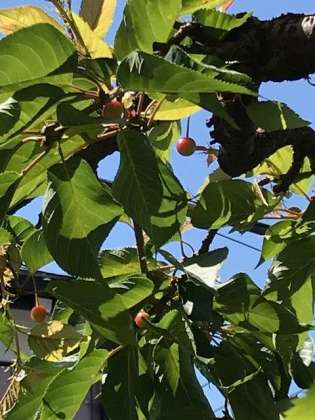現在の河津桜は、緑の葉っぱが生い茂って、赤く熟す前の実がたくさんなっています。3か月前とは、全く違う姿を見せています。