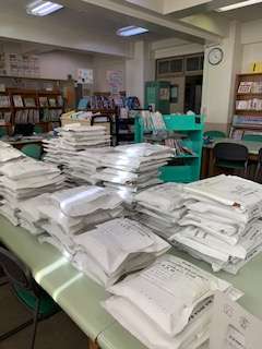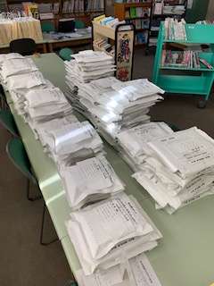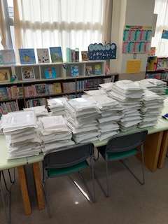 どのくらい申し込みがあったかな?と図書室に行ってみたら、たくさんの申し込みがあって司書さんたちが、ニコニコ嬉しそうにお楽しみ袋を作っていました。すごい、すごい。本が大好きな山崎の子がこんなにいっぱいです。
