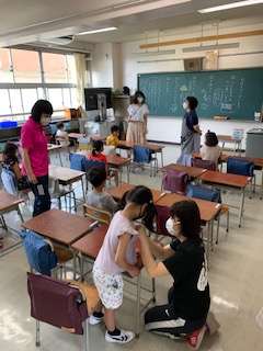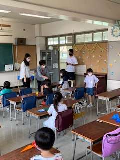 私も玄関でお出迎えしましたが、玄関、階段、水飲み場、おトイレ前、教室に手分けしてお迎えしました。