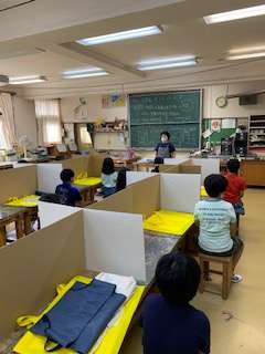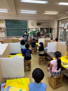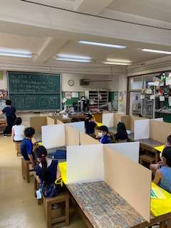 図工室の机は向かい合う形になるのでお手製のパーテーションでマイスペースを作りました。作品に集中するにはちょうど良いのかもしれませんね。