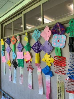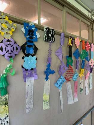 1年生の廊下の壁面に七夕飾りがありました。上手にはさみを使って飾りを作り、その下に、可愛い願い事がいっぱい。