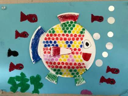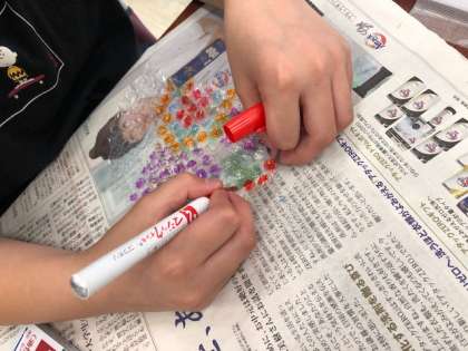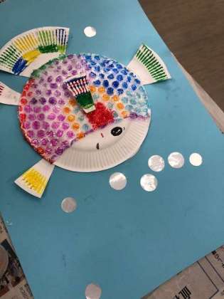 プチプチに好きな色を塗り、紙皿を使って魚の体とヒレを作りました。魚のヒレは、先日生活単元学習で勉強したので、バッチリです!