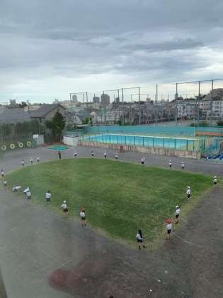 3階の窓から校庭を眺めると、ちょっと面白い景色が。
