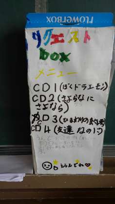 3年2組では、給食をおしゃべりしないで、楽しく食べるため、音楽を流しています。お楽しみ係さんが、リクエストボックスを作ってくれました。