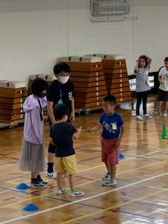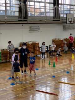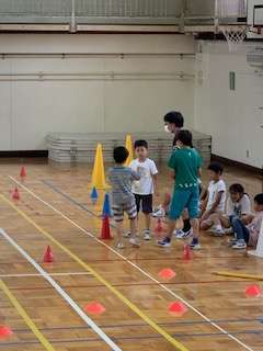 体育館いっぱいに、カラーコーンや棒がならんでいます。