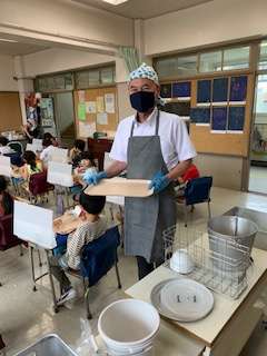 盛り付けが終わった給食を、ボランティアでお手伝いくださっている方、伝統工芸室の先生、専科の先生、副校長先生が一つ一つ子どもたちの机に運びます。