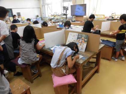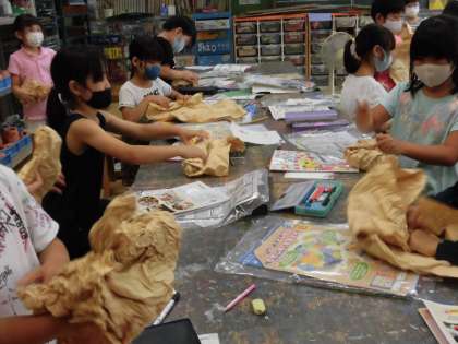 まずは、どんな作品を作るか紙に下絵を描きました。そして、クラフト紙をよくもんで柔らかくしました。体全体を使って、紙の感触を楽しんでいました。どんな作品に仕上がるのか、楽しみです!