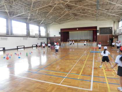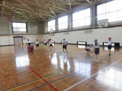 今日は体育の時間に避難訓練があったのですが、1組は体育館、2組は校庭で体育を行いました。校庭では、50m走を行いました。体育館では、「跳ぶ・投げる」運動を組み合わせて、サーキットを行いました。どちらの学級も元気いっぱい体を動かしました。