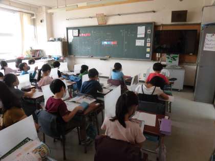 今までの学習では、たし算やひき算の場面をブロックや○を用いて表す学習を行ってきました。今日の学習は、、ブロックや○などで表してきた数量の大きさを、テープの長さに置き換える表し方を学びました。問題に対して、まずは「チャレンジ!」子どもたちの色々な考え方が出てきました。
