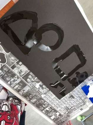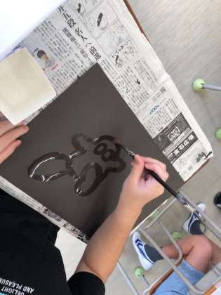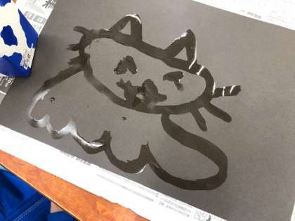 食塩水を絵の具の代わりに使って、黒画用紙に絵や模様を描いています。