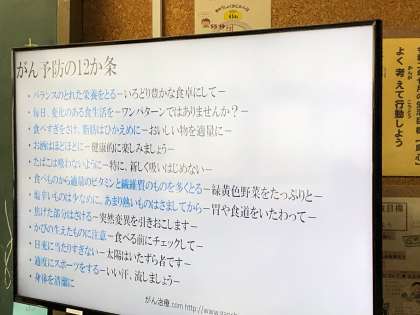バランスのとれた栄養、食べすぎを避ける、たばこは吸わない、日光に当たりすぎない…などの「予防」と、がん検診による「早期発見」の大切さを教えていただきました。
