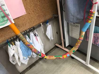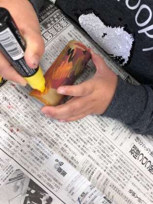 トイレットペーパーの芯にポスカで模様を描いて、スズランテープに通していくと、ビッグビーズの飾りの出来上がり!