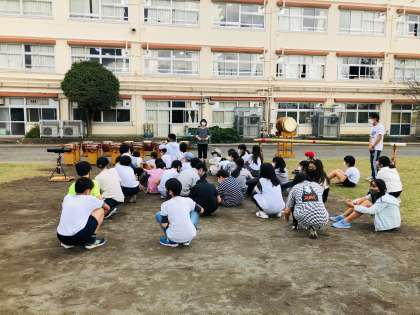 6年2組は、デビュー当日と同じ環境の校庭ではじめて山崎太鼓を演奏してみました。これまでは体育館で練習していたので、外だと音が響かず聞こえにくくなるのではという不安がありましたが、なんのその!しっかりと打ち込み、安心して聴ける太鼓となってきました。