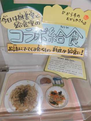 今日は「図書旬間 第7弾(最終日)」です。「からすのおかしやさん」という本から、みんなで「からすのおからケーキ」を食べます。
