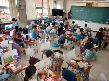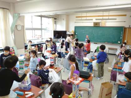 たくさん集めた箱はこの後、動物やロボットに変身する予定です。