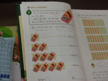 それから、1はこに「5こずつ」入っているドーナツの数について問題を考えました。