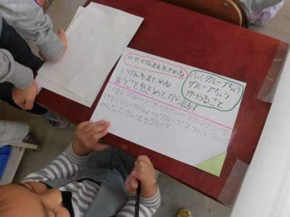 1つのグループでは、今日の話し合い活動を家で事前に考え、カードに書いてみんなの前で提示していました。