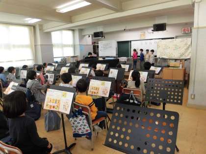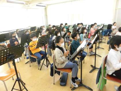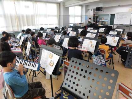 今日の学習は、音楽室で行いました。「小ぎつね」の曲の、鍵盤ハーモニカの指番号を、吹かずに鍵盤を押さえながら、復習をしました。