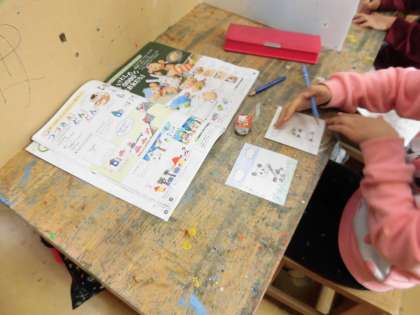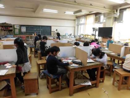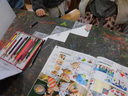 紙のつなぎ方をためしたり、見つけたりしてお話を考えました。紙の貼り方を工夫することで、お話がどんどん広がっていきますね。