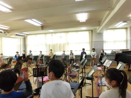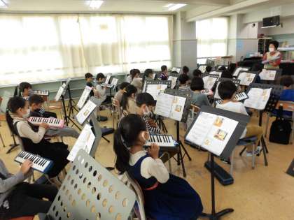 2組の音楽の学習の様子です。音楽室での学習だったので、鍵盤ハーモニカは吹かずに、鍵盤の上で、正しく指番号を動かす練習をしました。