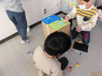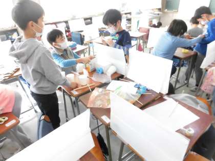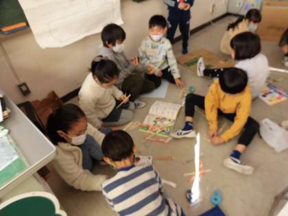 参考になるように、図書室から本を数冊借りてきたのですが、子ども同士でアイディアを出し合いすすめていました。