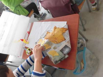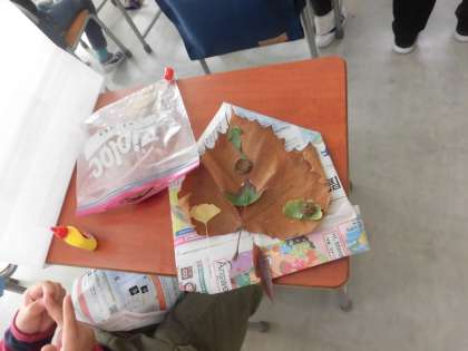 拾ってきた葉を使って、素敵な帽子ができあがっていました!!