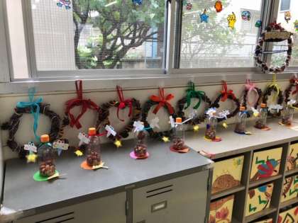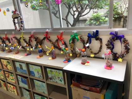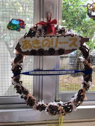 秋の物を使って作ったリースと、以前作った秋色ボトルを、仲よしの教室前に展示しています!