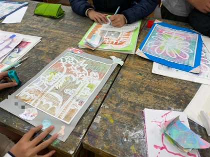 四年生の図工では、彫刻刀に取り組んでいます。