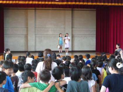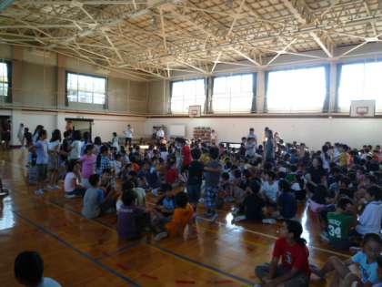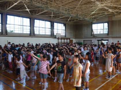 集会委員の歌に合わせて一緒に歌い、そしてポーズをつくり、示された動物の名前の文字数で仲間を集め、手をつなぎ早く座る、とうい競争的な要素も盛り込まれ、楽しいひとときを過ごすことができました。