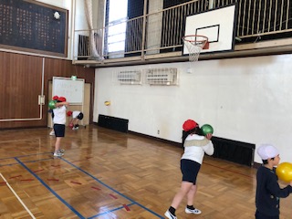 ボールを壁に当てたり、ゴールにシュートしたり。
