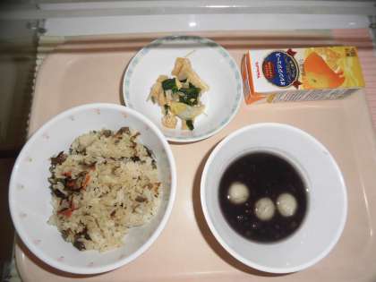 今日から3学期の給食が始まりました。1月10日の「鏡開き」にちなんで、給食初日の今日は、みんなが元気に過ごせるように願って「白玉しるこ」を食べます。