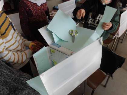 休み時間には、同じ係の友達と集まり、何やら作成しています。
