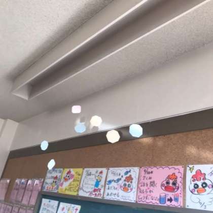 1枚目の写真は、かざりつけ係さんが折り紙とテグスを使って、教室に浮いている雪を作ってくれました。