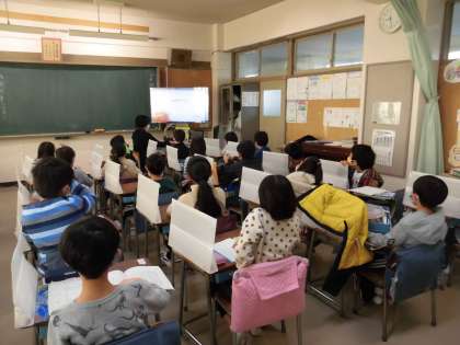 お話が始まると、子どもたちは、テレビ画面を観ながら