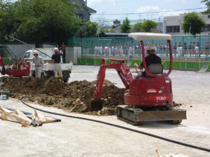 写真は、今日の工事の様子です。校庭の掘削作業が本格化しました。水道配管工事・既設スプリンクラーの撤去・新しいスプリンクラー設置のための作業が行われています。