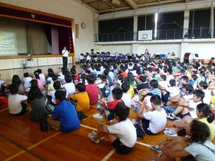 笛木世田谷中学校長の体験学習についての話に続き、吹奏楽部による生演奏を鑑賞しました。今日のために一生懸命練習を積み重ねてきた演奏は、心に響きわたり印象に残りました。