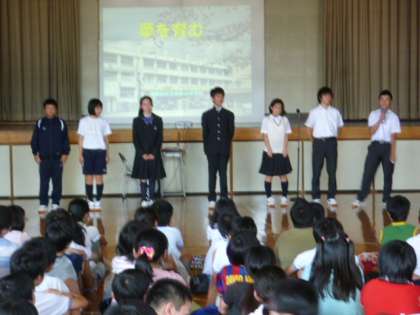 次に、生徒会役員のみなさんによる、制服の紹介、学校生活や部活動紹介、学校行事の紹介などがあり、子どもたちは真剣に聞き入っていました。その後、中学校の先生方による授業に参加しました。自分で希望した教科の授業に参加し、中学校の教室で45分間の学習に取り組みました。