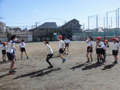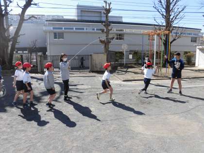 グループに分かれ、5年生に大縄の跳び方のコツを