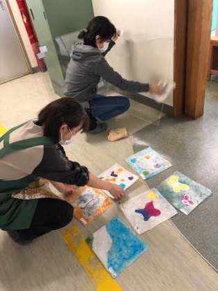 トイレの入り口は、透明ガラスではめ込み、作品を挟み込むことができるようになっています。20年以上も前から、4年生が紙の体験学習で漉く作品を展示するようになっています。