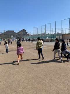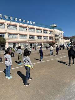 校庭に広がった子どもたちが不自然に固まっています(笑)