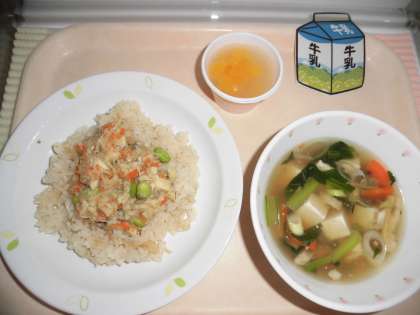 今日は「ひなまつり」です。また、6年生を送る会が行われたので「おめで鯛こんだて」になっています。給食用に無償でいただいた愛媛県の「真鯛」をそぼろにしました。また、「ひなまつり」ということで、もものゼリーをみんなで食べます。