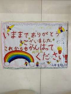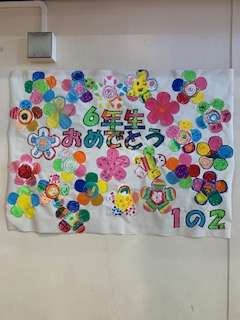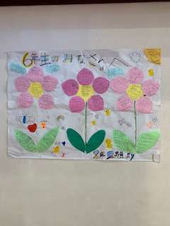 各クラスから6年生へのメッセージです。写真だとわかりませんが大きな模造紙に書いて壁に貼りました。