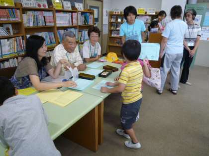 受付で「夏休み、図書室へ来たよ!」カードを受け取り、好きな本を選び、思い思いの場所で読んでいました。