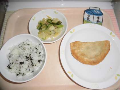 リクエストの第1位に輝いた「ジャンボぎょうざ」をみんなで食べます。直径15センチの皮で作るジャンボぎょうざは、給食ならではの大きさです。